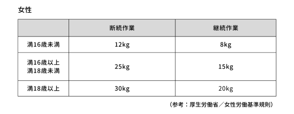 ※満18歳以上の女性は、厚生労働省の「職場における腰痛予防対策指針及び解決」において、男性が取り扱う重量の60%程度に留めることが義務付けられています。