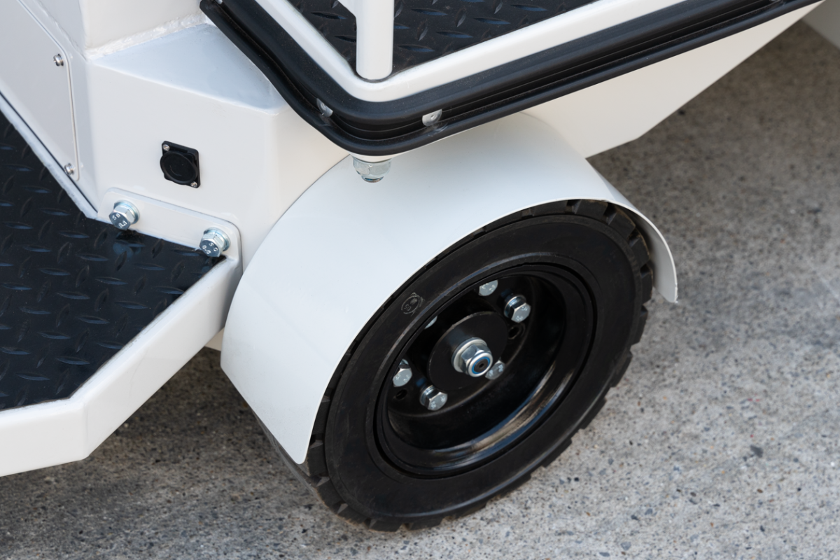 乗れる電動台車「エネライド 500F」はハンドル部分には雨よけカバーが付いており、屋外でも安心して作業できます。