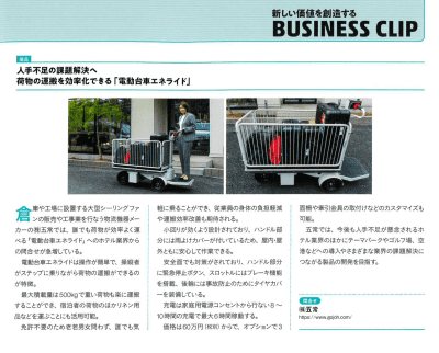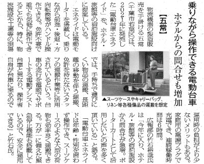 BS11の「耳より!Bizトレンド」や、青果流通の専門紙「農経新聞」、集客ビジネスの経営戦略誌「月刊レジャー産業資料7月号」、宿泊業界の専門誌「国際ホテル旅館」、旅行・観光の情報サイト「トラベルスポット」で電動台車エネライドが取り上げられました。