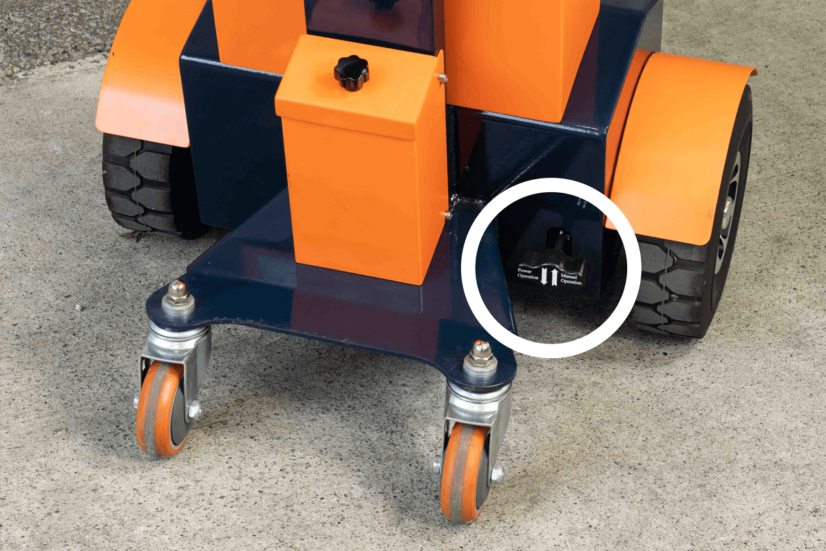 電動アシスト牽引車「パワフルバディ」はスイッチを押して電源オン。