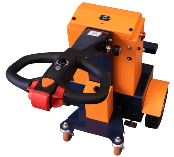 電動アシスト牽引車「パワフルバディ」のハンドル部分と本体横に緊急停止ボタンがあります。