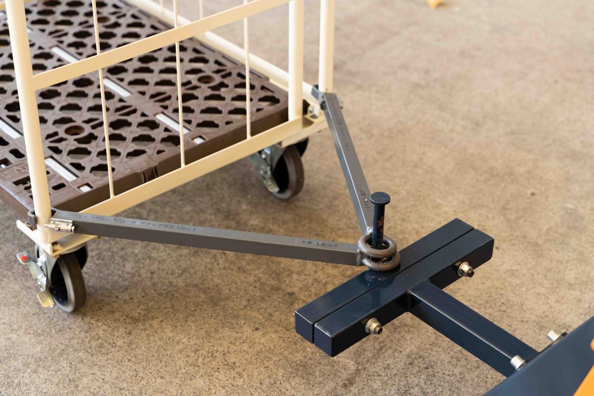 カゴ台車などを牽引する、2本1セットのアタッチメント金具です。